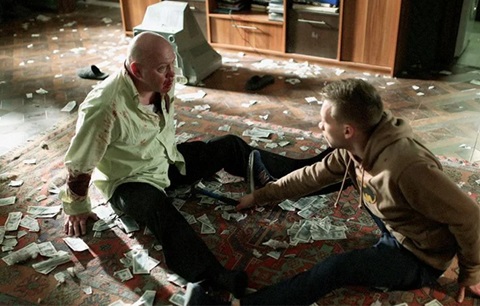 マトヴェイが逃げると、弾はソファに当たりそこから大金が散らばります